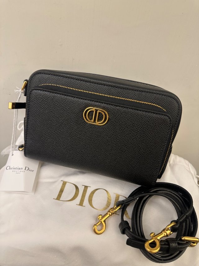 DIOR CD LOGO BLACK PEBBLED LEATHER CARO DOUBLE POUCH CROSSBODY BAG