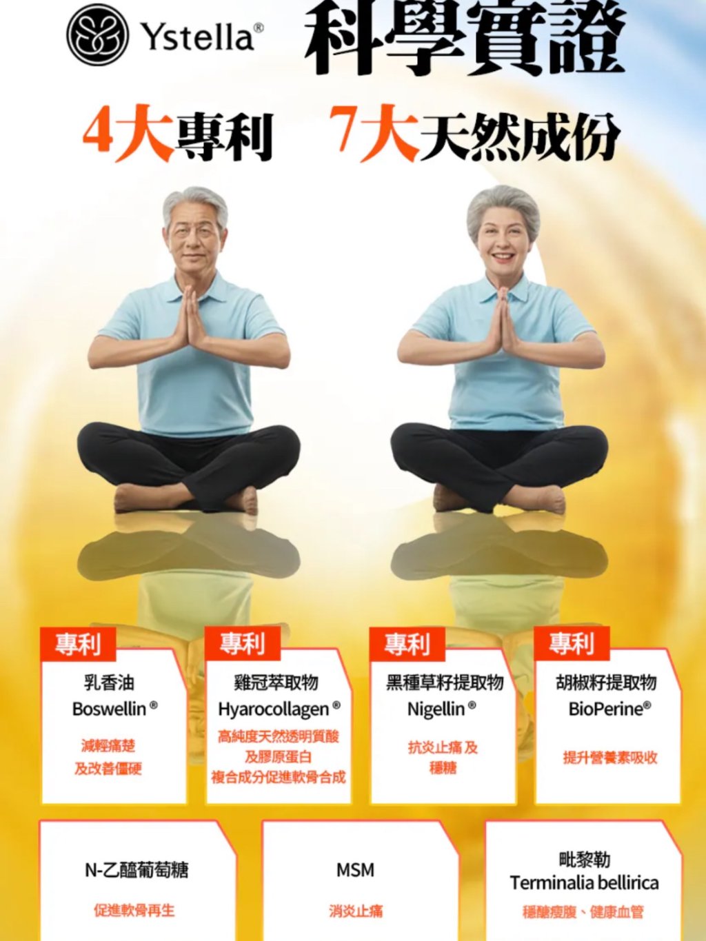 • 🦴 修復軟骨:專利玻尿酸 + N-乙醯葡萄糖 + MSM, 三大修復軟骨元素