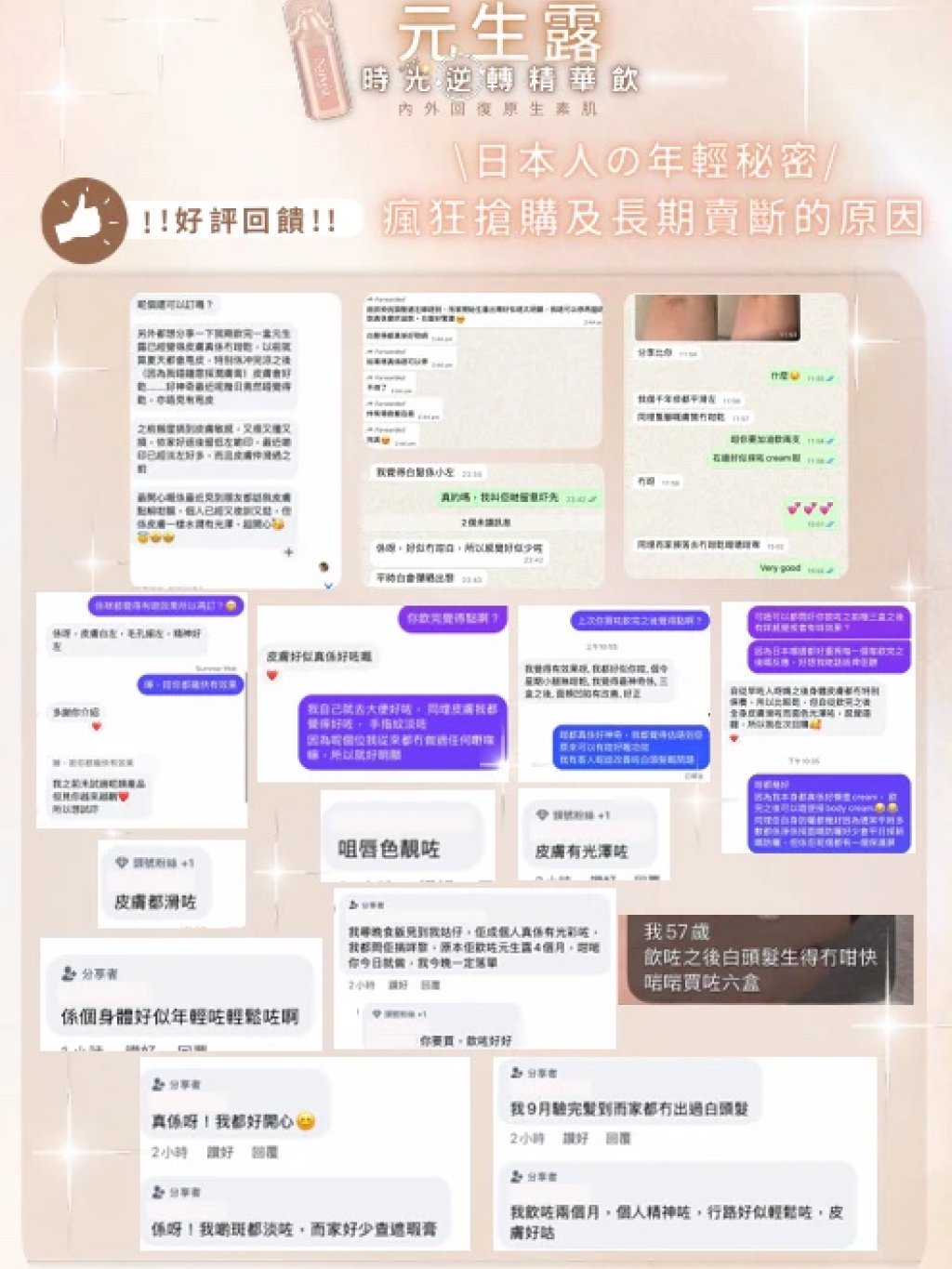 隨著年紀增長,皮膚老化、紫外線傷害、脫髮問題等接踵而來,⿣大王牌特許成分,⿨項特許專利,一支美顏健美飲品🍸解決多重煩惱。元生露結合米糠🌾、大豆🫘和玫瑰花瓣🌹專利成分,具備卓越的美容與健康功效,擁有豐富科學數據支持,發揮美膚、抗疲勞與調理體質的多重作用。無糖、低卡、清爽無負擔,Keep住年輕。100%日本製造🇯🇵,品質保證