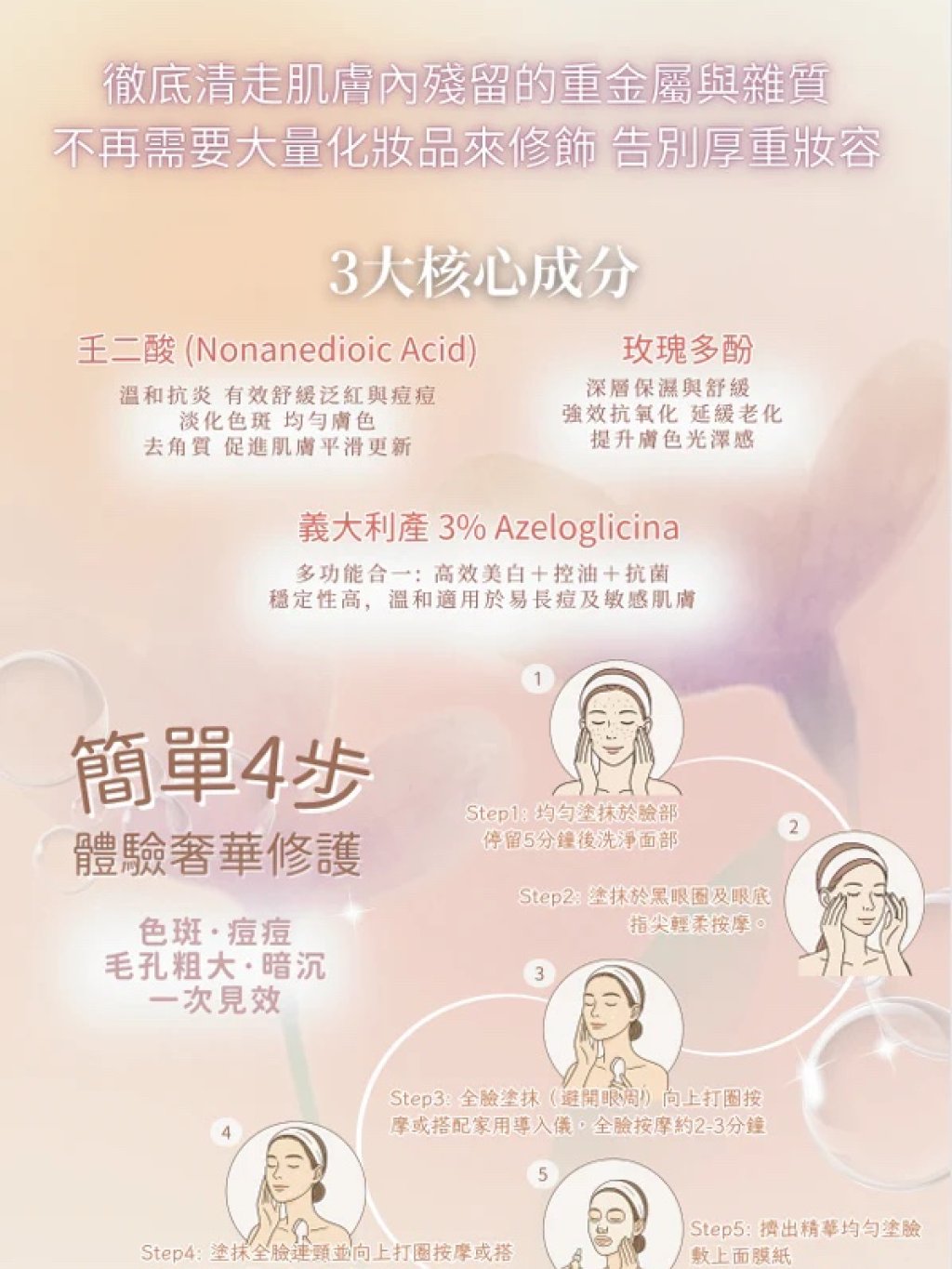 3.一套多效,全面改善:同步處理痘痘、色素沉澱、毛孔粗大與膚色不均。