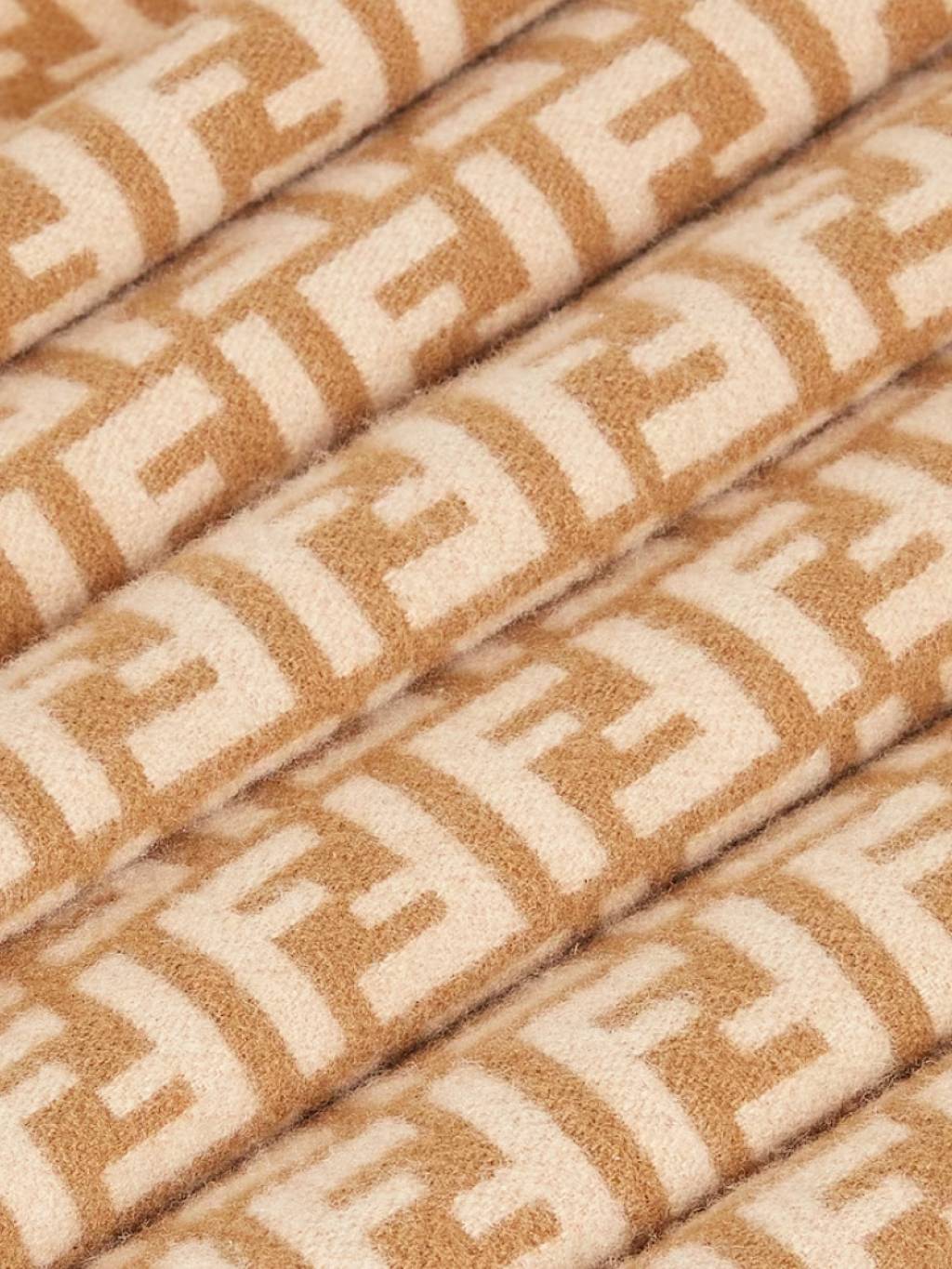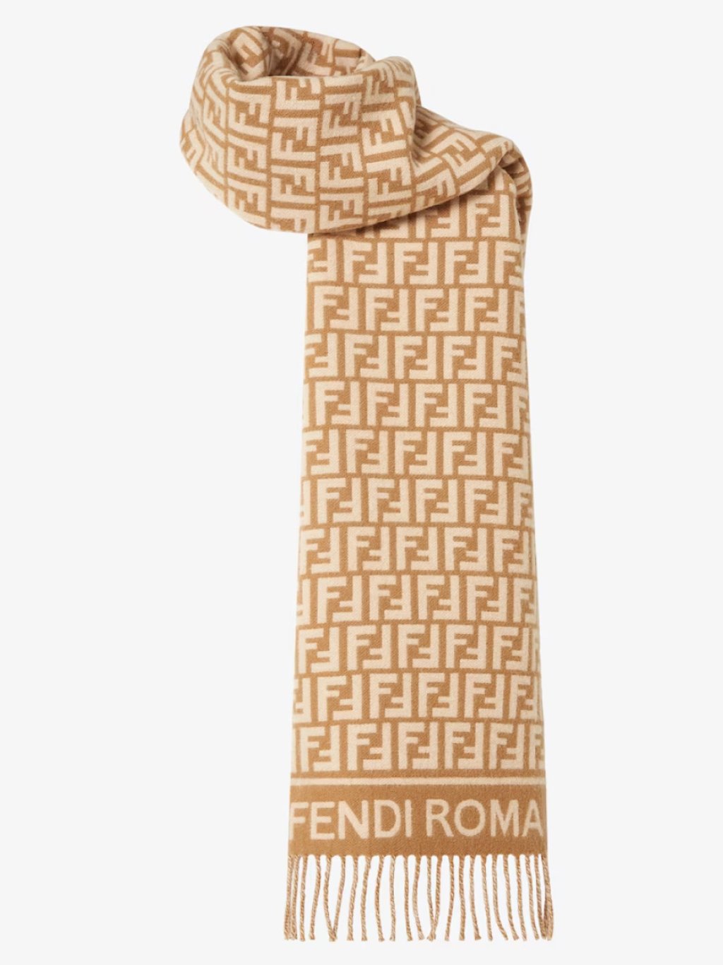 Scarf made of wool and cashmere yarn with an all-over camel jacquard FF motif. Embellished with Fendi Roma logo and fringes on the ends.
