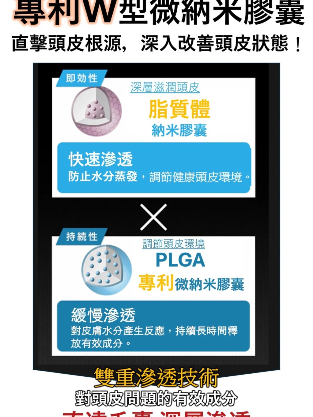 ✓ 採用專利「PLGA微納米膠囊」×「脂質體」雙重滲透技術,深入頭皮