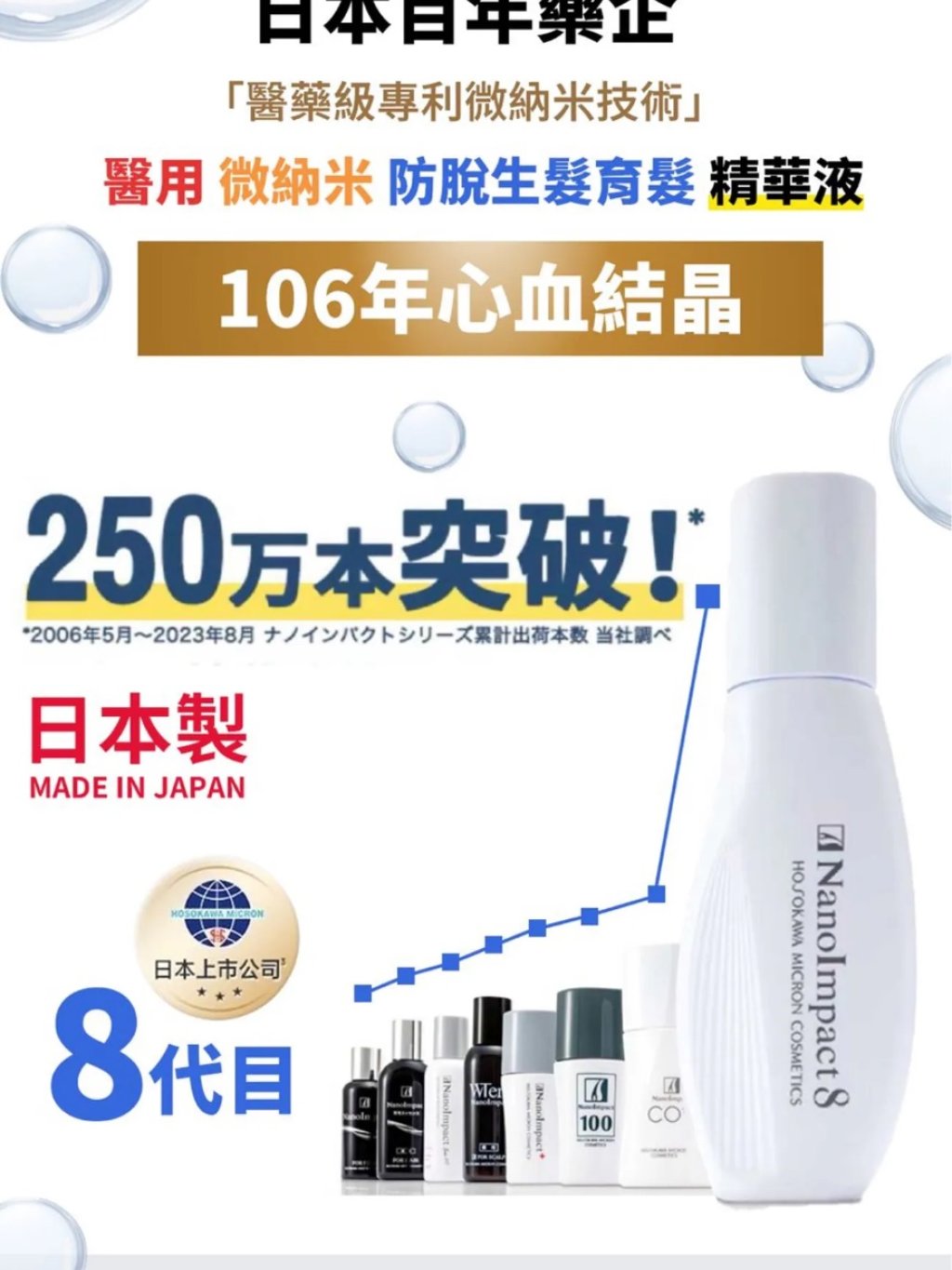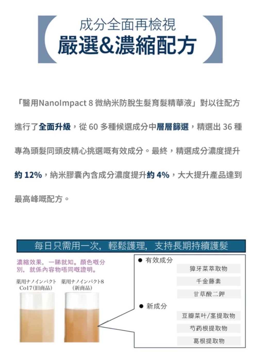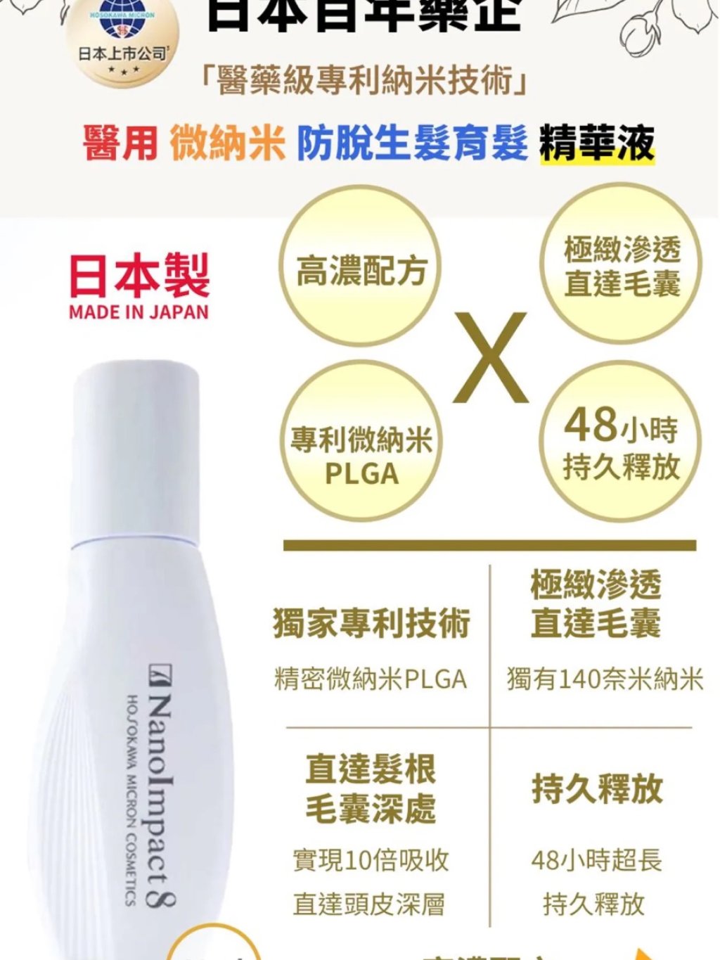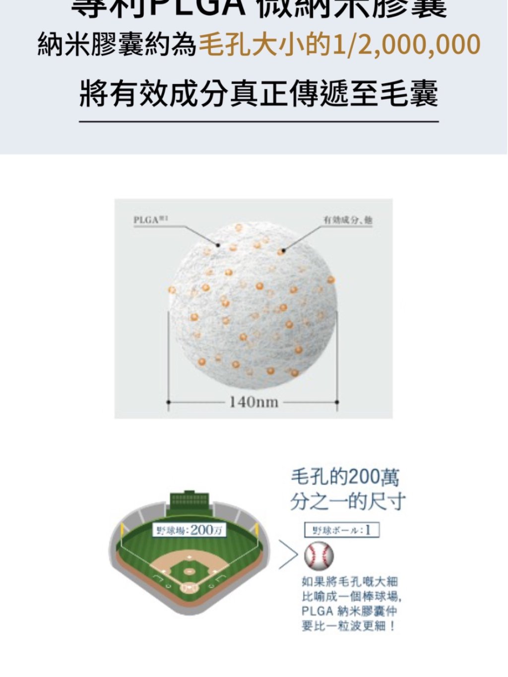 每支(60ml)所含的 PLGA 納米膠囊以 120 萬億顆的高濃度製成,將多種活性成分細緻包裹於納米載體之中,更精準地輸送至髮根毛囊深處。