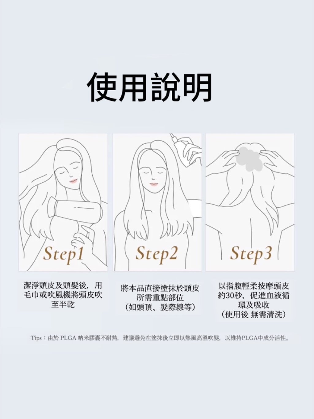 l 有效成分: 由 PLGA 納米技術支援,能穩定承載多種自然草本防脫固髮成分