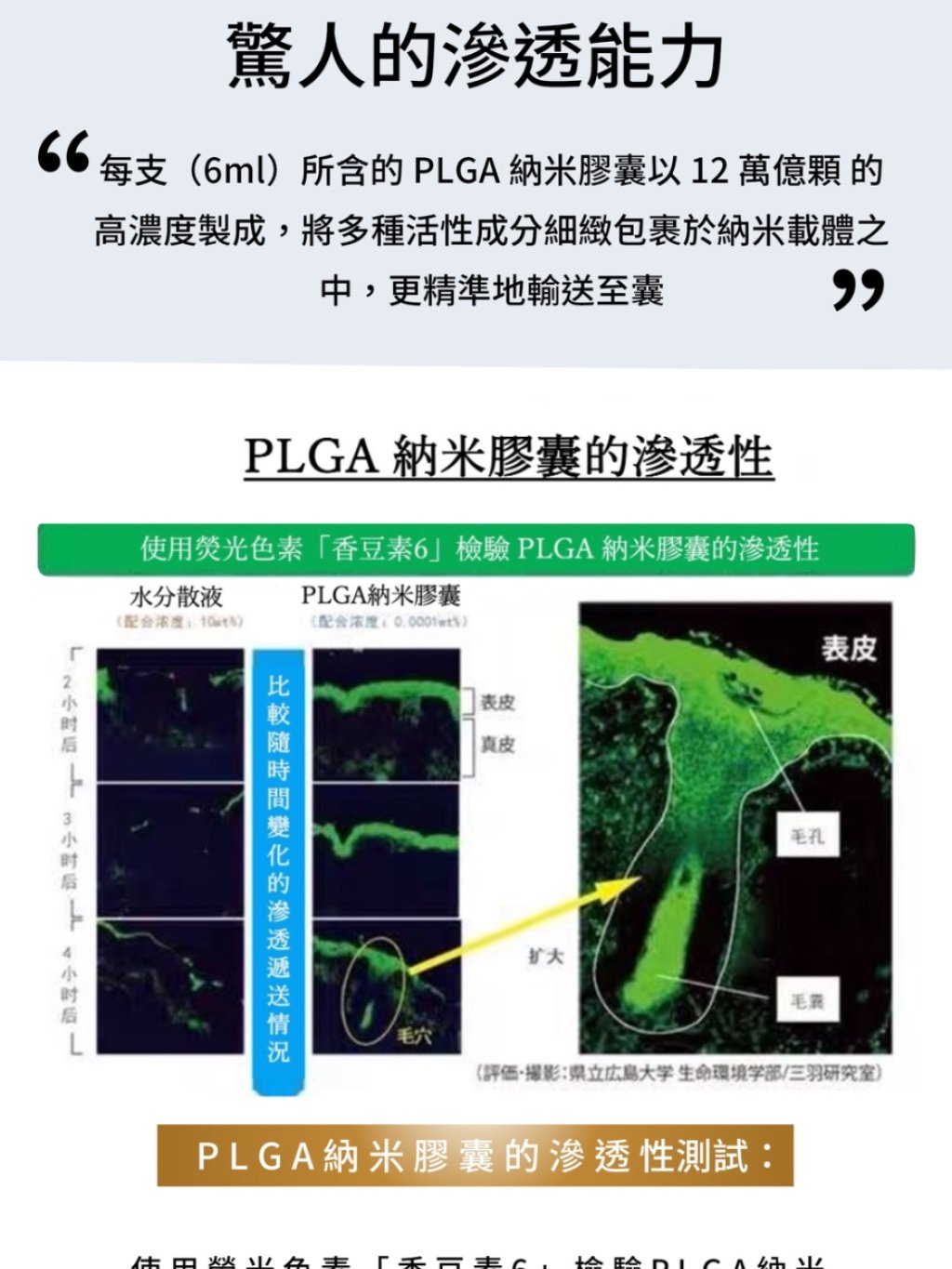 使 ⽤ 熒 光 ⾊ 素 「 ⾹ ⾖ 素 6 」 檢 驗 P L G A 納 ⽶ 膠 囊 的 滲 透 性,能穿過表皮及真皮層,直達毛囊。
