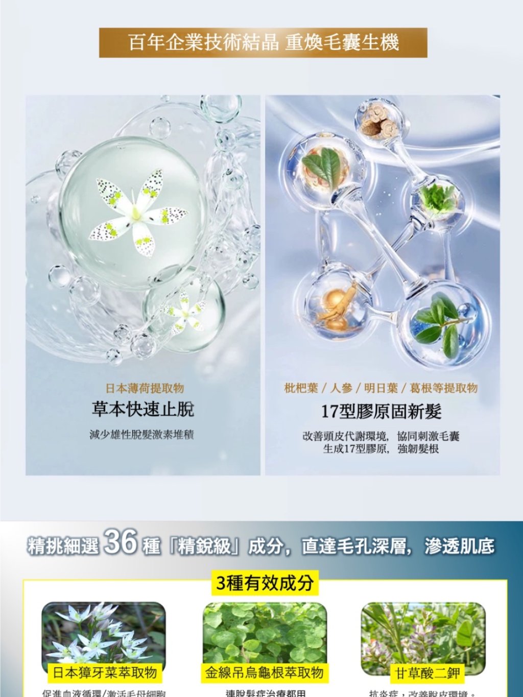 ✅17型膠原固新髮,主要成份枇杷葉 / 人參 / 明日葉 / 葛根等提取物,改善頭皮代謝環境,協同刺激毛囊生成17型膠原,強韌髮根