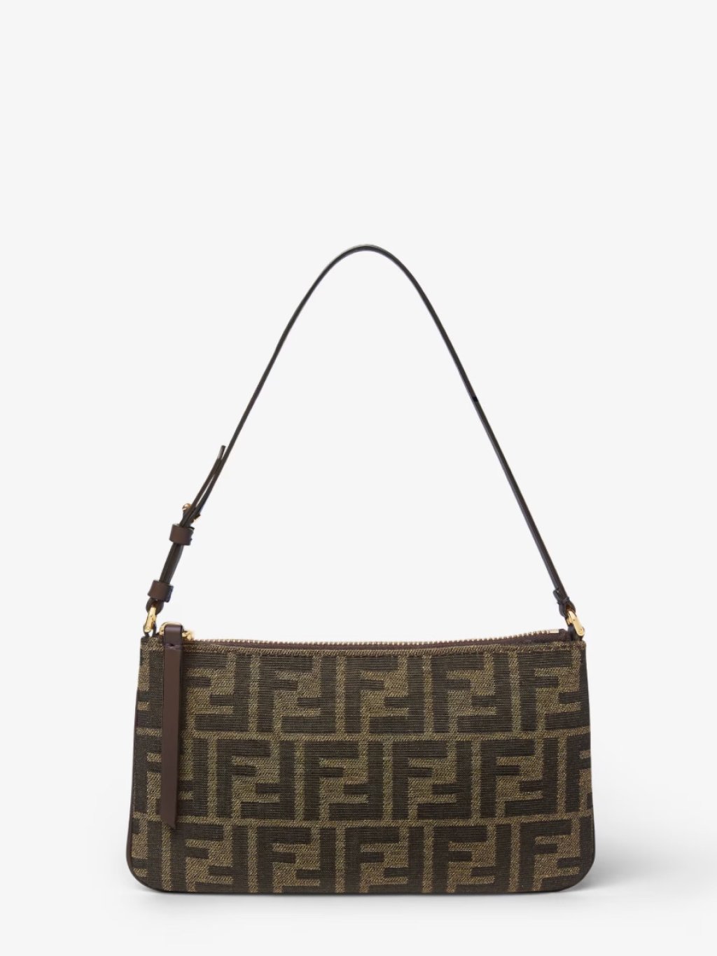 Slim Baguette pouch with zip closure, embellished by an FF motif leather zip pull. Adjustable and openable short shoulder strap on one side to allow dual portability, under arm and by hand. Made of FF jacquard fabric in tobacco brown. Details in dark brown calfskin. Gold-finish metalware.