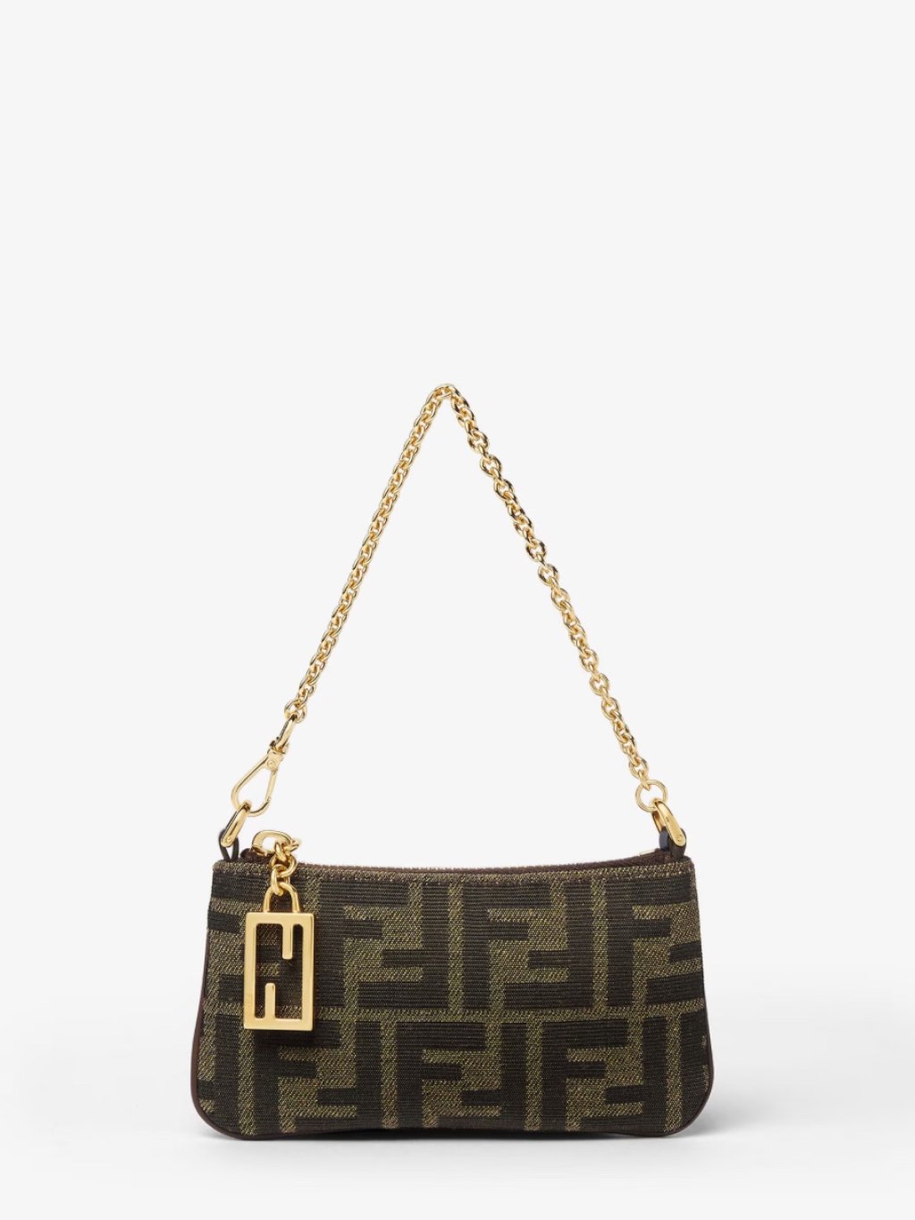Mini Baguette pouch with zip and zip-pull in iconic FF motif for closure. Short chain shoulder strap, with openable snap hook on side to attach the accessory. Lined. Made of FF jacquard fabric in tobacco brown. Gold-finish metalware.