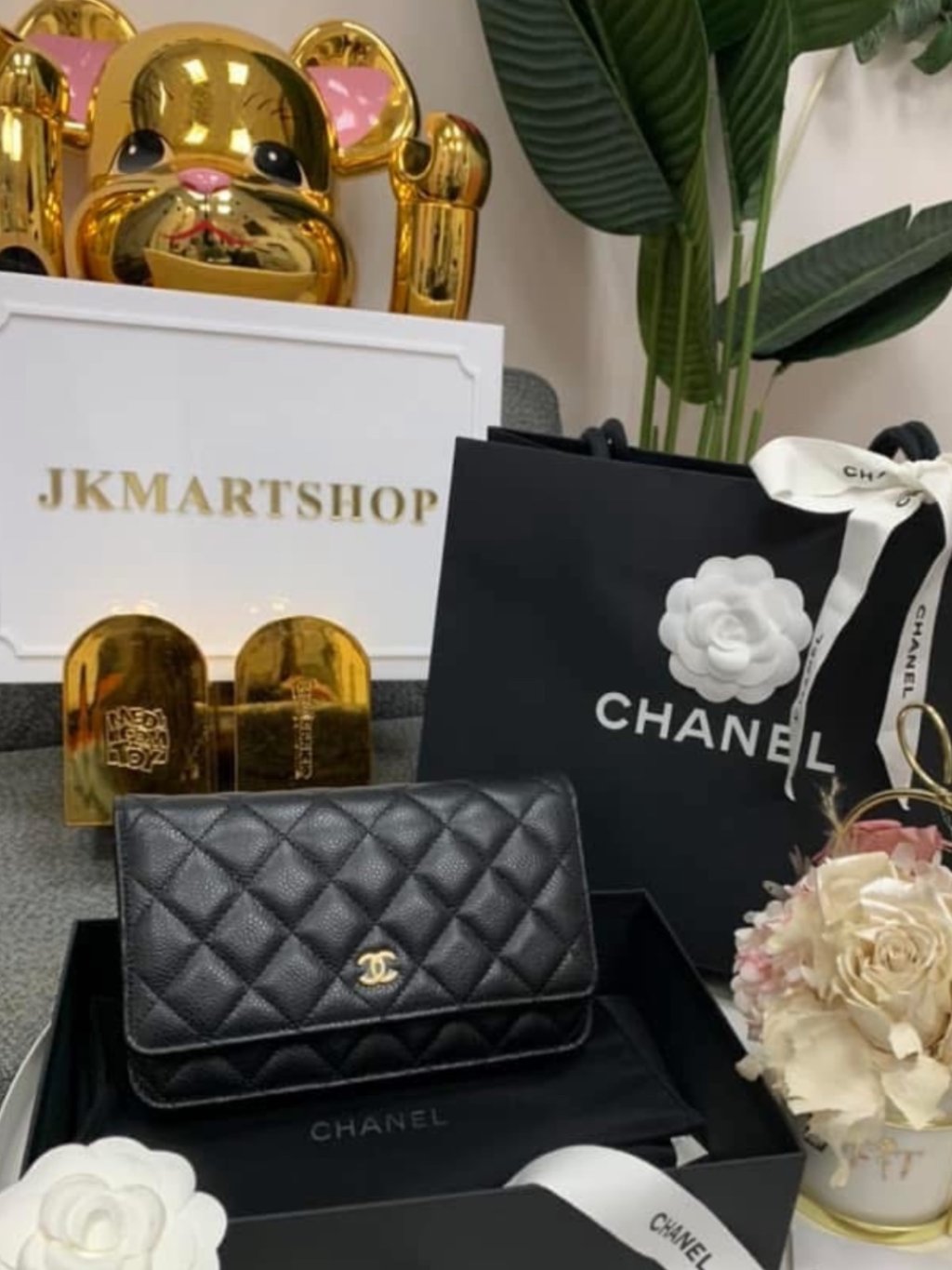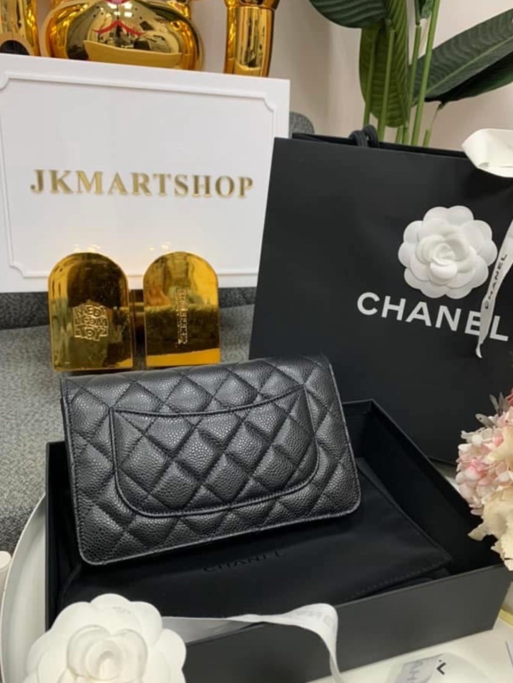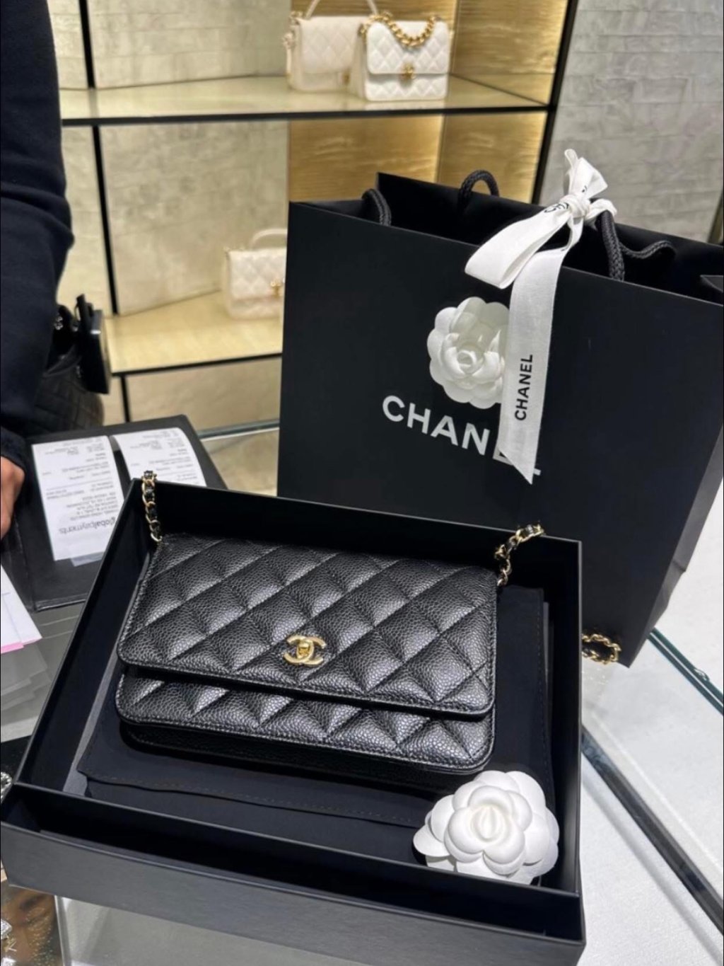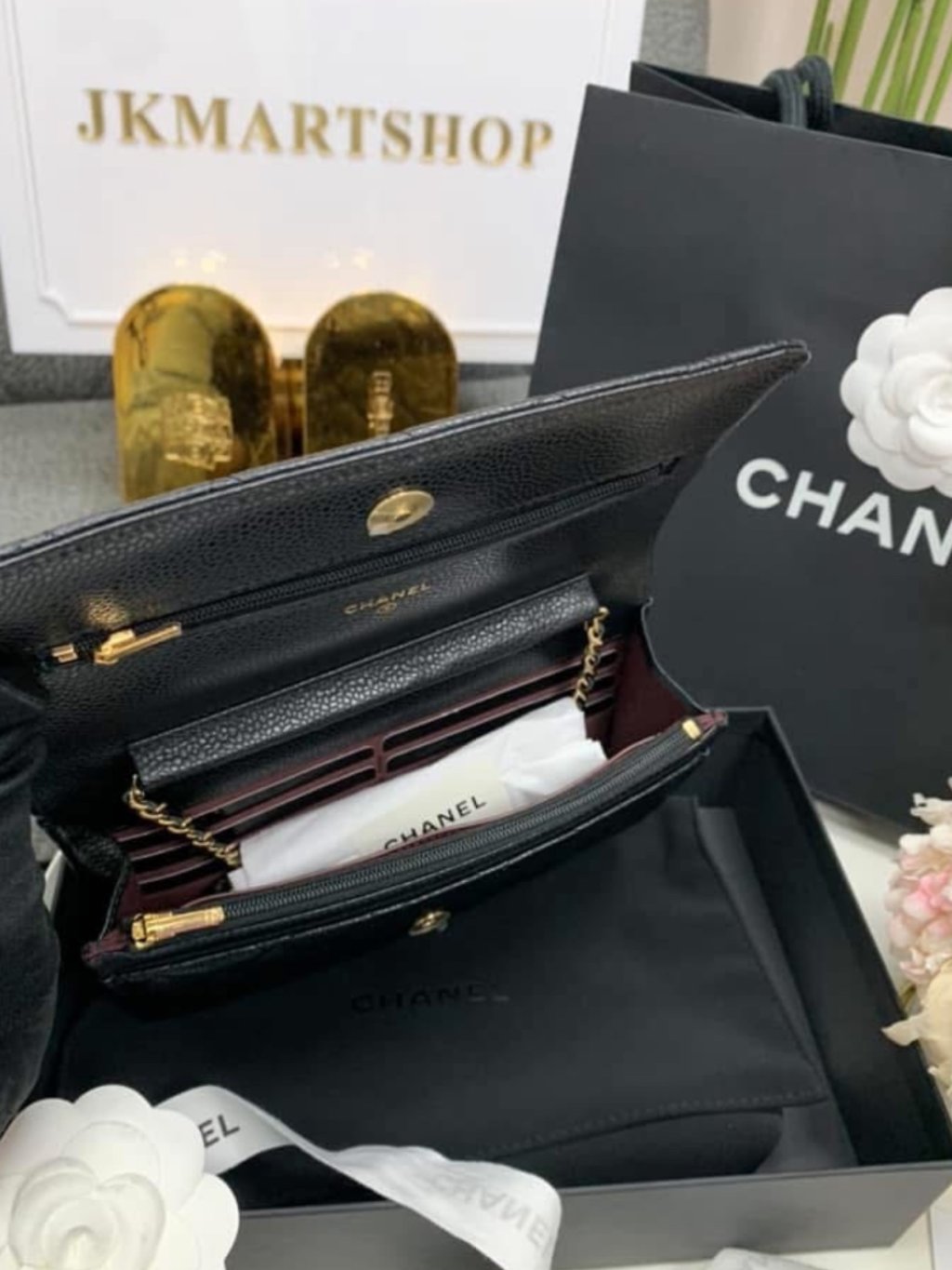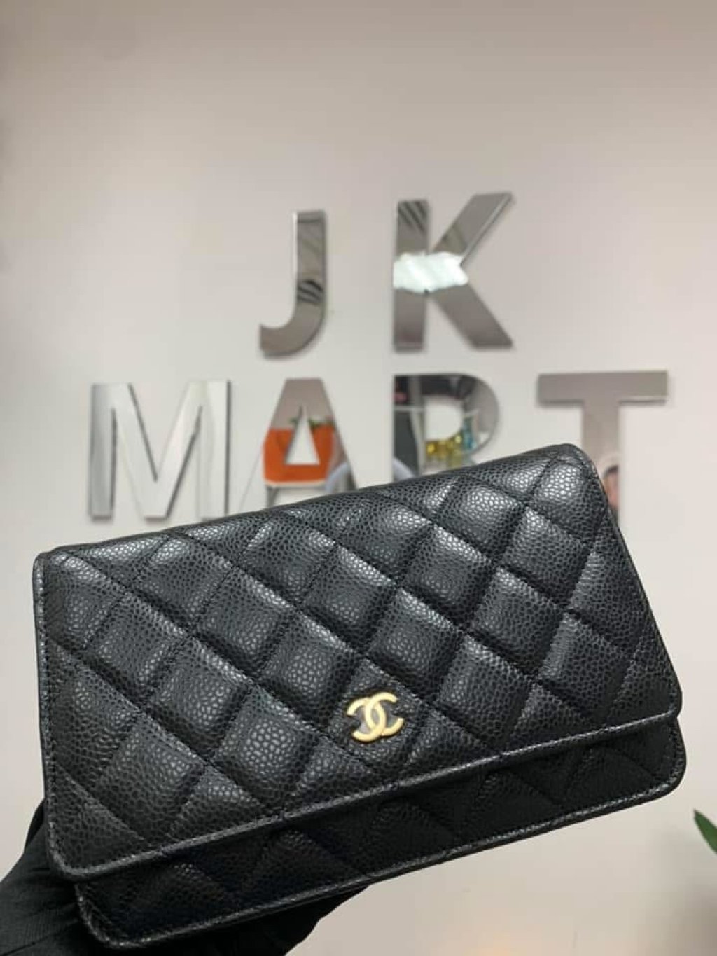 CHANEL CLASSIC CC GOLD BLACK CAVIAR LEATHER WALLET ON CHAIN