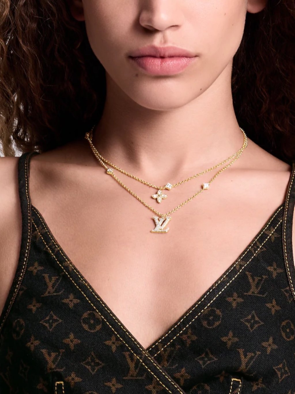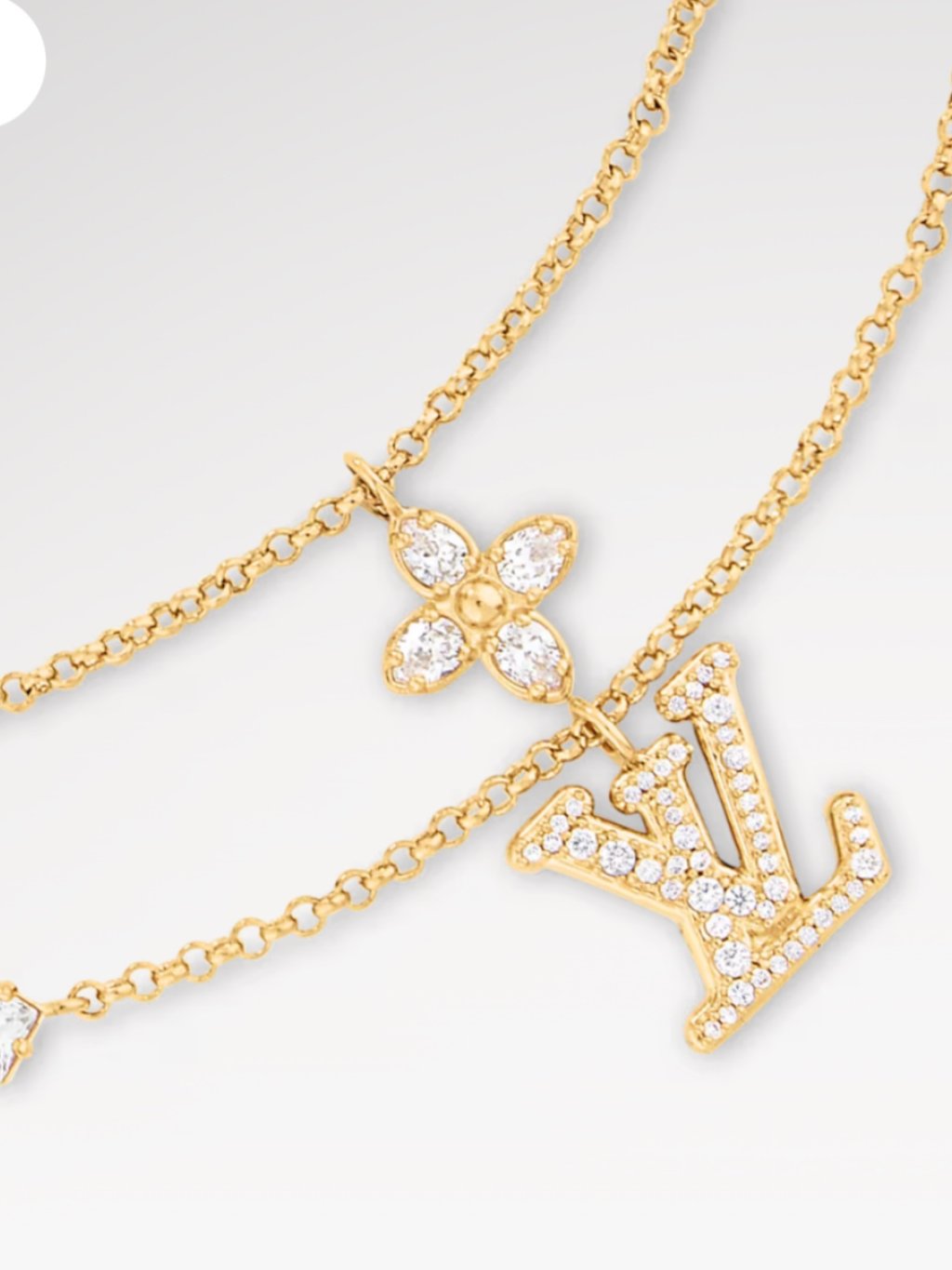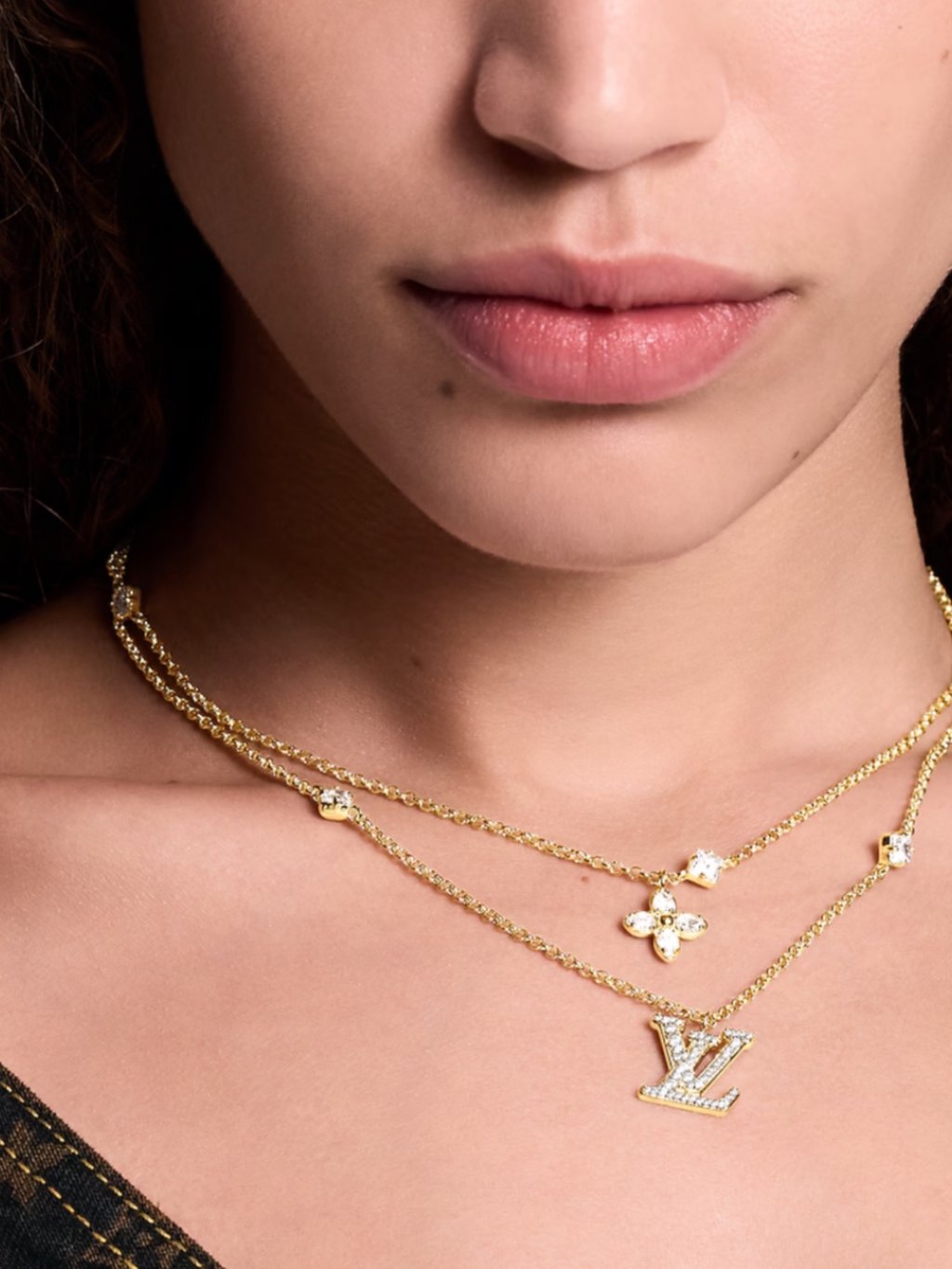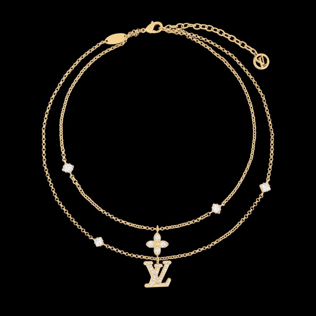The Lady LV Necklace features a double-strand design crafted in gold-tone metal enhanced with sparkling crystals. Two fine-linked chains are adorned with a Monogram Flower and an LV signature charm, symbolising purity and feminine discretion. Four additional crystals bring an extra glint of glamour to this sumptuous, sophisticated necklace.