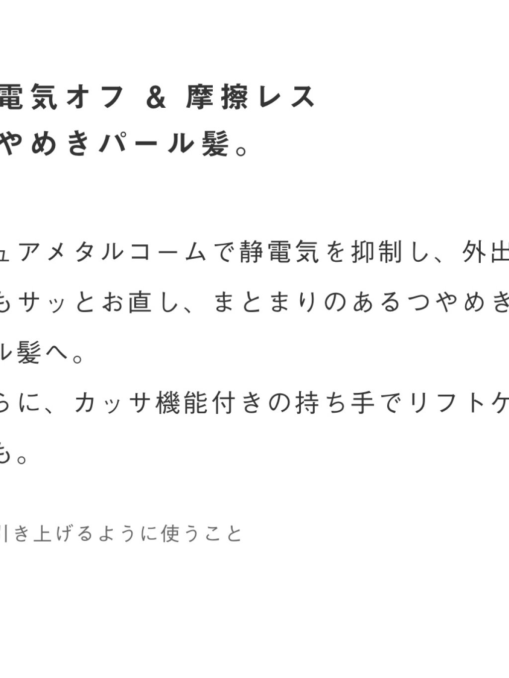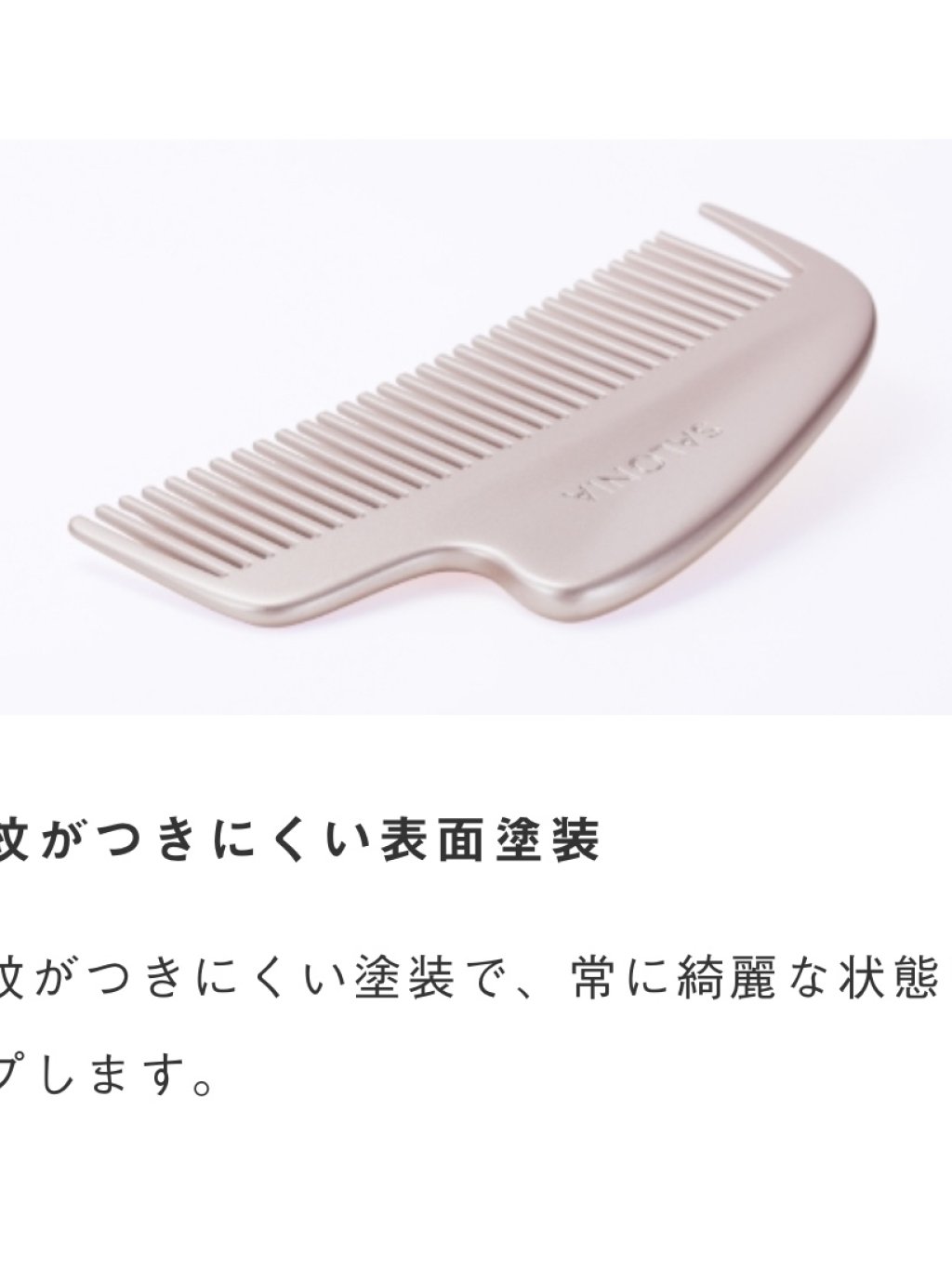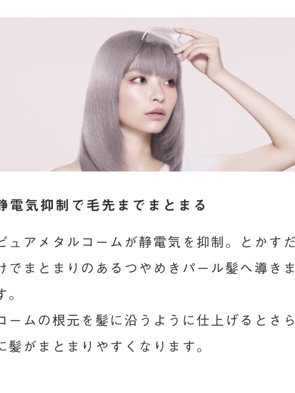 ピュアメタルコーム=メッキも材質も金属で、静電気オフと上質な質感を実現。とかした瞬間※まとまるツヤ髪へ。