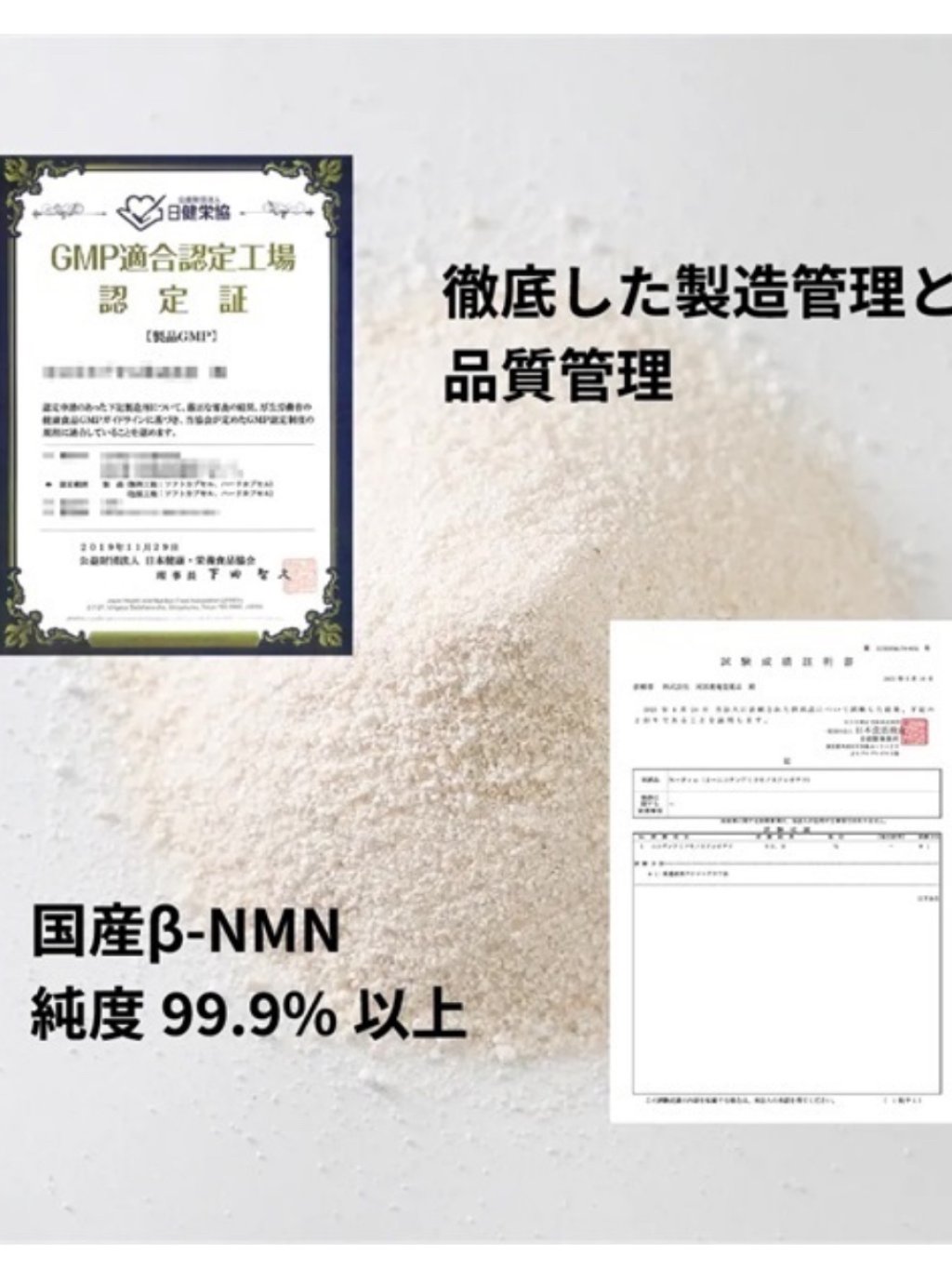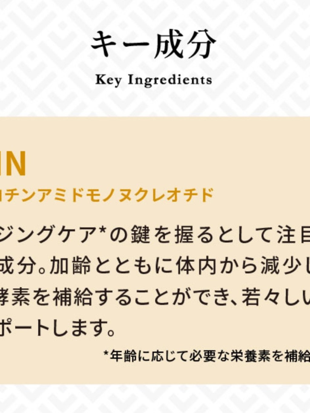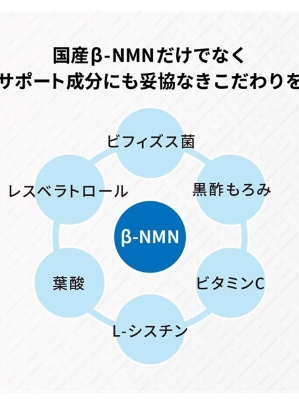 β-ニコチンアミドモノヌクレオチド(国内製造)、ビフィズス菌末(デキストリン、ビフィズス菌(殺菌))、黒酢もろみ末、醗酵黒ニンニク末、赤ワインエキス末(レスベラトロール含有)/HPMC、結晶セルロース、ステアリン酸カルシウム、L-トリプトファン、ビタミンC、L-シスチン、ゲル化剤(ジェランガム)、カラメル色素、ナイアシン、二酸化ケイ素、ビタミンE、パントテン酸カルシウム、ビタミンB₂、ビタミンB₆、ビタミンB₁、ビタミンA、葉酸、ビタミンD、ビタミンB₁₂